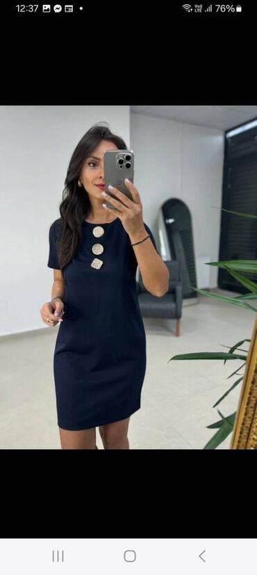 Elegantna mini haljina ravnog kroja sa kratkim rukavima i okruglim izrezom. Na prsima su tri dekorativna, velika dugmeta/jedinstveni ukrasni medaljoni koji daju sofisticiran izgled. Dužina do iznad kolena, blago strukirana silueta, glatka tkanina koja lepo pada i ne providi se. Idealan model za posao, dnevne i večernje prilike, lako se kombinuje sa sakoom ili kardiganom.