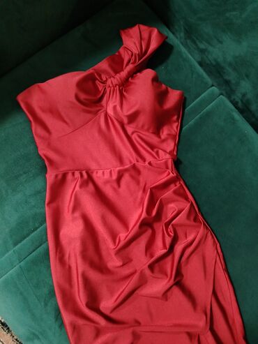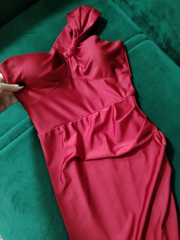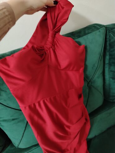 Elegantna crvena haljina od satenskog sjajnog materijala. Model sa jednom bretelom koja se formira u dekorativnu mašnu/čvor na ramenu. Gornji deo ima oblikovane korpe i šavove koji naglašavaju struk, dok su duž bokova i prednjeg dela blage drapirane naborane linije koje vizuelno izdužuju figuru. Dužina do ispod kolena (midi), kroj pripijen uz telo. Idealna za večernje prilike, proslave i posebne događaje. Boja: intenzivna crvena. Zatvaranje nije vidljivo na fotografijama (verovatno bez rajsferšlusa, rastegljiv materijal).