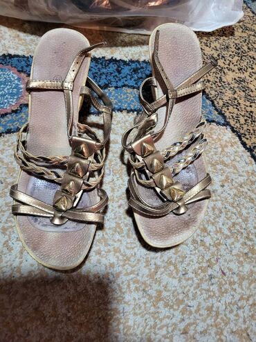 Ženske sandale OPPOSTIE – model Gold, veličina 37 - Boja: zlatna metalik - Dizajn: elegantne sandale sa tri tanke prednje kaiš-trake i jednim kaišem oko zgloba sa kopčom - Peta: visoka, blok peta ...