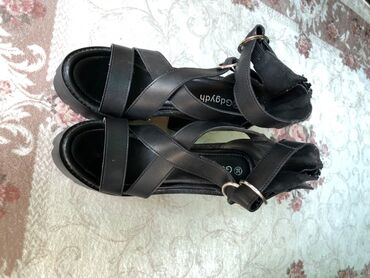 Ženske sandale na platformu - Veličina: 39 (oznaka na đonu) - Gornji deo: kombinacija crne trake i trake u printu imitacije zmijske kože - Kopčanje: dve metalne kopče sa bočne strane za podešavanj...