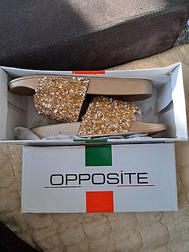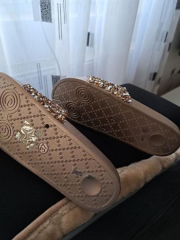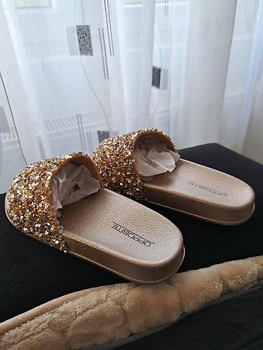 Zlatne papuče ukrašene šljokicama. Ove papuče su elegantne i udobne, idealne za nošenje kod kuće ili za opuštene izlaske tokom toplijih dana. Lako se kombinuju uz različite stilove. Nove su, prodajem jer sam greškom kupila pogrešan broj.
