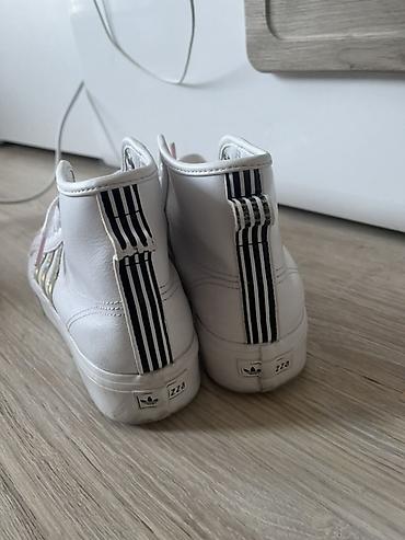 - Dizajn: visoke patike sa klasičnim pertlama; jezik sa ružičastom etiketom “adidas”