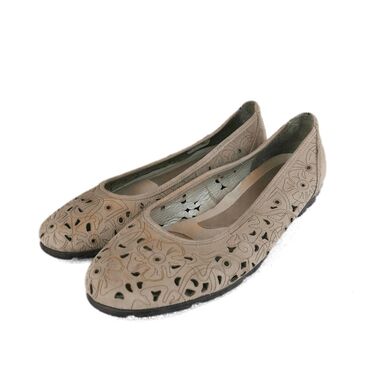 Ženske baletanke – bež/svetlosive - Materijal: meka koža (gornjište), kožna ili kožnata postava i uložak - Dizajn: izrezani perforirani detalji oko ruba i sa strane; utisnuti cvetni ornamenti na v...