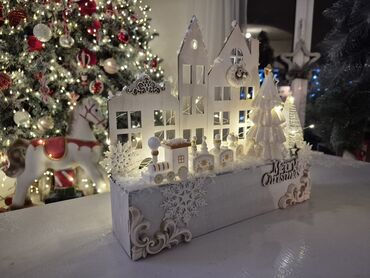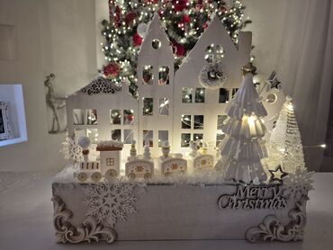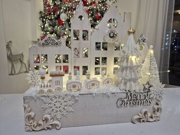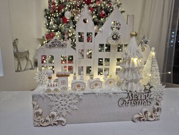 - Ručno rađen aranžman u beloj i zlatnoj boji: fasade kućica, 3D jelka, minijaturni vozić sa vagonima, pahulje i ukrasne bordure.