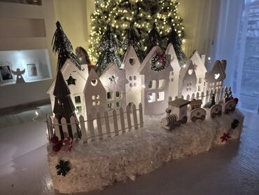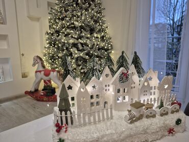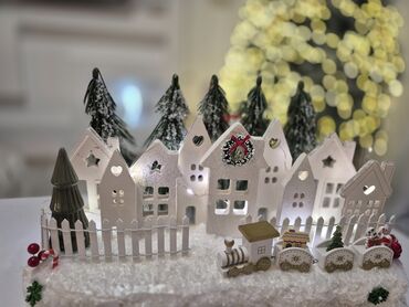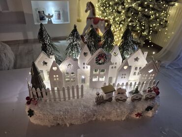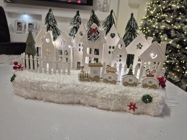 - Detalji: minijaturni vozić sa lokomotivom i tri vagona, novogodišnji venčić na jednoj kući, bombonice/štapići, pahulje i zeleni ukrasi.