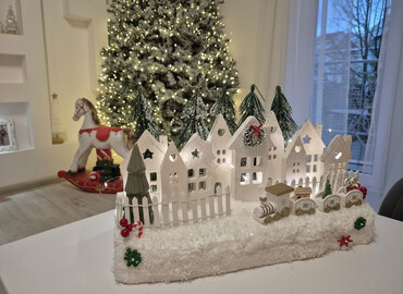 - Ugrađena topla LED rasveta diskretno osvetljava kućice i stvara prazničnu atmosferu (vidljivo svetli i u polumraku).