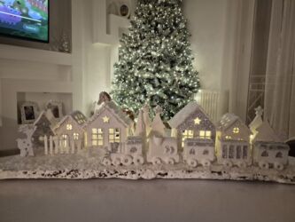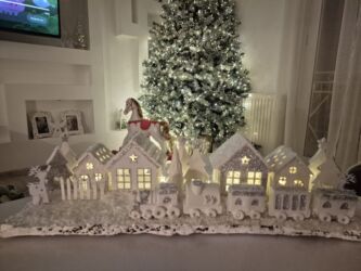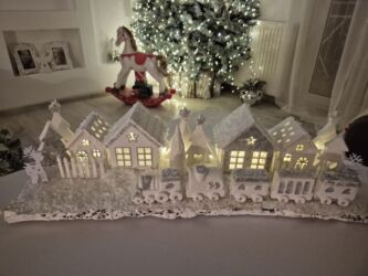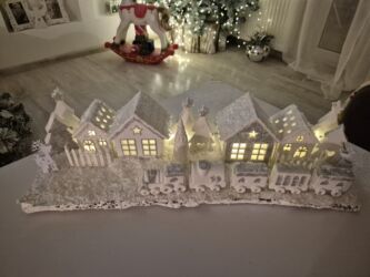 - Prelepa zimska scena na jednoj osnovi: niz belih kućica sa prozorčićima, jelke, ograda i irvas, sve prekriveno „snegom” i srebrnim šljokicama.
