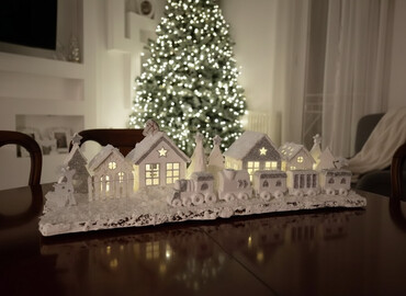 - Ugrađena topla LED rasveta u kućicama i jelci stvara nežan, ambijentalni sjaj.