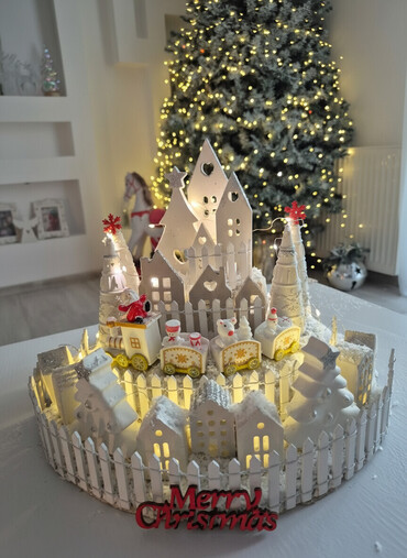 - Centralni deo čini “snežni zamak” i kućice sa izrezbarenim prozorima i srcima,