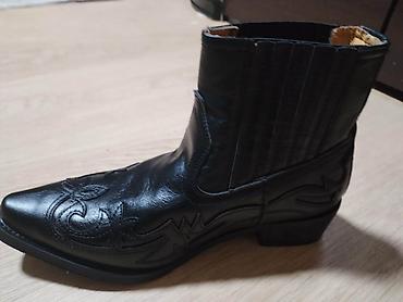 Crne kozne kaubojske cizme br 40. Stanje: novo. Materijal: koza. Velicina: 40. Kopcanje: na navlacenje. Vrsta potpetice: srednja stikla -Materijal:prirodna koza. -Boja:crna sa dekorativnim stepovima. -Vrh:izduzen/siljat. -Visina:do sredine lista Stajling:odlicne za dnevne i vecernje kombinacije, farmerke,haljine ili suknje.Udobna blok peta pruza stabilnost,a siljati vrh i dekorativni stepovi naglasavaju autentican western izgled