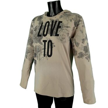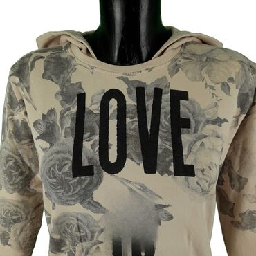 Ženska dukserica s kapuljačom - Boja: crna osnova sa štampanim velikim slovnim motivima u beloj i bež/taupe nijansi - Kroj: komotan, duži model sa elastičnim ranflama na rukavima i donjem rubu - K...
