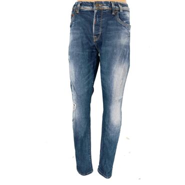 Muške skinny farmerke u tamno-plavom denimu sa izbleđenim efektom i izraženim “distressed/ripped” detaljima na nogavicama. Klasičan pet-džep kroj: dva prednja džepa sa malim novčanik-džepom i dva p...