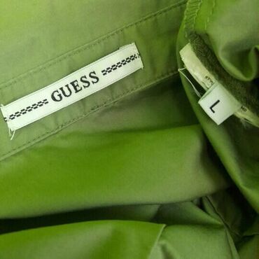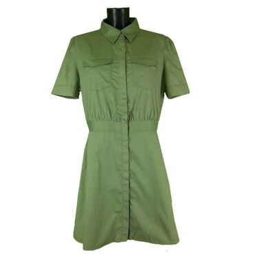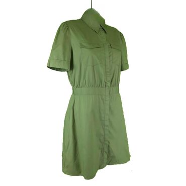 Haljina guess, vel.l marka: guess veličina: l materijal: pamuk dužina: 90 cm širina ramena: 42 prečnik struka: 43 prečnik grudi: 53 cm šifra: bk5145 originalna ženska haljina guess u odličnom stanju (pogledajte slike).. Zeleno-sive boje, kratkih rukava, dužine do kolena.. Dva prednja džepa s poklopcem na grudima, zakopčavanje na dugmiće celom dužinom haljine.