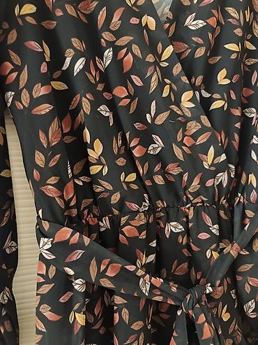 Haljina s printom listića - Model: midi haljina s preklopom (V-izrez)