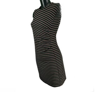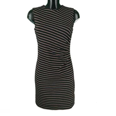 Haljina therapy, vel.. M/8 marka: therapy veličina: m/8 materijal: poliester 84% viskoza 11% elastin 5% dužina: 89 cm ramena: 36 cm 38 cm prečnik grudi: 41 cm šifra: bk6666 originalna haljina therapy london u odličnom stanju, kao nova (pogledajte slike).. Crne boje, prugast dezen, dužine ispod kolena, zakopčavanje na skriveni rajsferšlus na leđima, izrađena od kvalitetne kombinacije materijala.