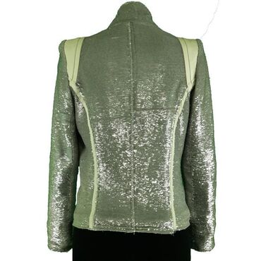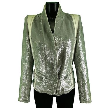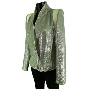 ŠljokiceJakna iro, vel.. M/40 marka: iro veličina: m/40 materijal: poliester 95% viskoza 3% elastin 2% dužina: 57 cm ramena: 39 cm rukavi: 64 cm prečnik grudi: 55 cm šifra: ja0472 skupocena, originalna ženska jakna iro u odličnom stanju (pogledajte slike).. Srebrne boje, sa naramenicama, sjajan, šljokičast materijal, postavljena, sa delovima od prave kože na kojima postoje tragovi nošenja - potrebno čišćenje po prijemu.