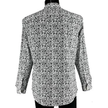 Ženska košulja na dugmad, dugih rukava, sa klasičnim kragnom. Crna baza sa celopreko geometrijskim printom u svetlosivoj boji (ponavljajući uzorak slova/monograma). Prednji deo sa punom kopčanjem i...