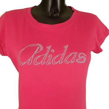 Majica adidas, vel.. S/36, pamučna marka: adidas veličina: s/36 materijal: pamuk 100% dužina: 64 cm ramena: 45 cm prečnik grudi: 50 cm šifra: bk4022 ženska majica adidas u odličnom stanju (pogledajte slike).. Roza boja sa logotipom od cirkona.. Prijatna, meka.. Preporuka!!!
