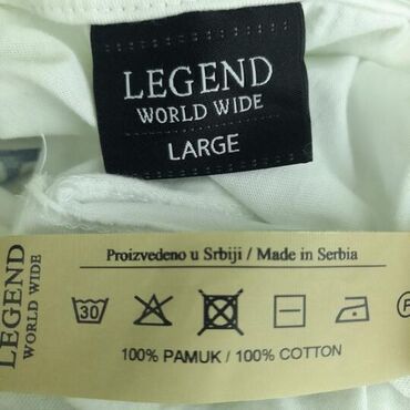 Majica legend, vel.. L marka: legend veličina: l materijal: pamuk 100% dužina: 73 cm ramena: 50 cm rukavi: 23 cm prečnik grudi: 60 cm šifra: bk5510 originalna muška majica legend u odličnom stanju (pogledajte slike).. Bele boje, velika aplikacija na prednjoj strani, ovalan izrez, izrađena od čistog pamuka, izuzetno prijatna za nošenje.. Preporuka!