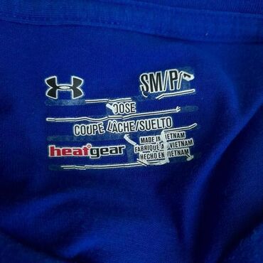 Majica under armour, vel.. S marka: under armour veličina: s materijal: pamuk dužina: 79 cm ramena: 45 cm rukavi: 26 cm prečnik grudi: 54 cm šifra: bk5524 originalna muška majica under armour u odličnom stanju (pogledajte slike).. Kraljevsko plave boje, ovalan izrez, pamučna, sa velikom aplikacijom na prednjoj strani, prijatna za nošenje.