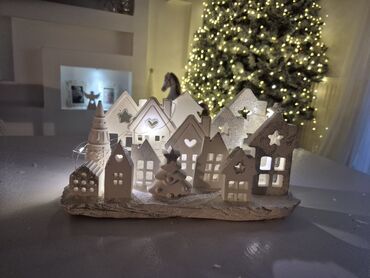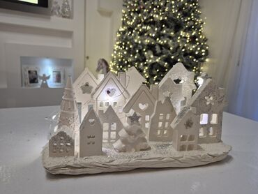 - Elegantno belo minijaturno „selo“ sa kućicama, jelkom i tornjem, postavljeno na dekorativnoj osnovi.