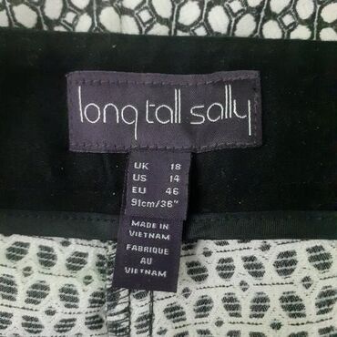 Drugi brendPantalone long tall sally, vel.xl/46, za visoke žene marka: long tall sally veličina: l/w31 l34 materijal: poliester 54%, elastin 3%, viskoza 43% dužina: 119 cm prečnik struka: 51 cm unutrašnja nogavica: 91 cm prečnik nogavice dole: 22 cm šifra: bk4671 originalne ženske pantalone long tall sally u odličnom stanju, kao nove (pogledajte slike).. Crno bele, toplije, džepovi sa strane i nazad.. Marka namenjena visokim ženama.. Perfektne!. Preporuka!!