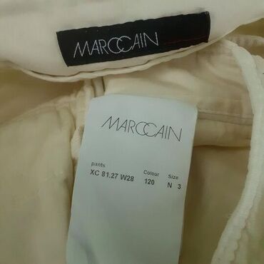 Pantalone marc cain, vel.m/38, somotske marka: marc cain veličina: m/38 materijal: pamuk 97%, elastin 3% dužina: 107 cm prečnik struka: 44 cm unutrašnja nogavica: 80 cm prečnik nogavice dole: 19 cm šifra: bk4667 originalne ženske pantalone marc cain u odličnom stanju (pogledajte slike).. Boja je više prljavo bela, nego čisto bela.. Tanak somot, izuzetno prijatan, mek i kvalitetan.. Malo tegljive.. Nose se šire.. Marc cain veličina je n3, što je ekvivalent evropskom 38 broju.. Preporuka!!
