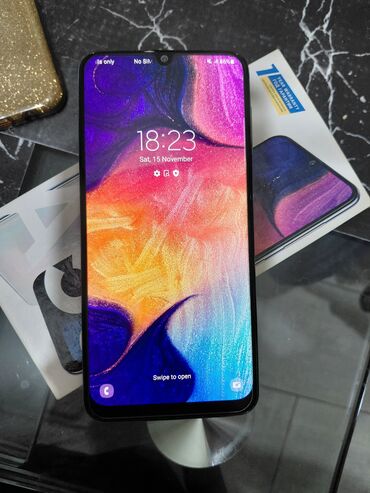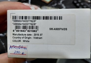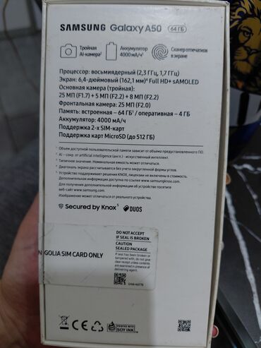 - Memorija: 64 GB interne memorije (oznaka na kutiji “A50/64GB”), proširiva microSD karticom