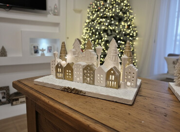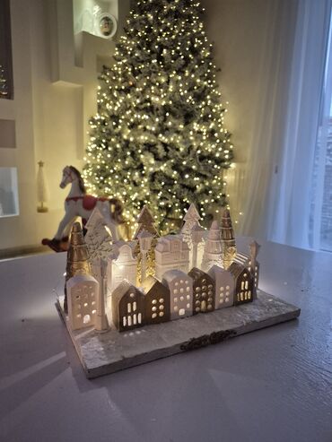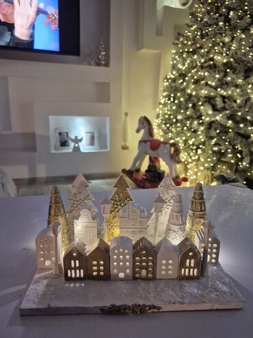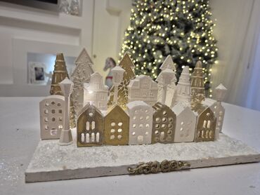 - Dekorativna maketa na postolju, ručno rađena u beloj i zlatnoj boji, sa efektom snega i šljokica.