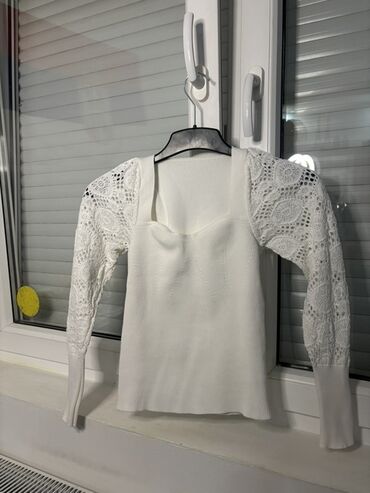 Bela ženska džemper-bluza sa čipkastim rukavima