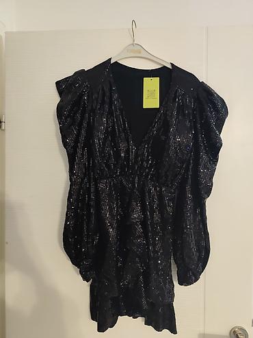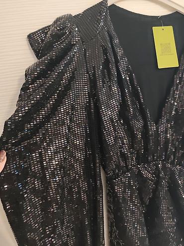 ZARA haljina sa šljokicama - Model: košulja-haljina sa kragnom i dugmadima sprijeda - Boja: crna, efekt šljokica po celoj površini - Rukavi: dugi, sa manžetnama od satenskog/sjajnog materijala - K...