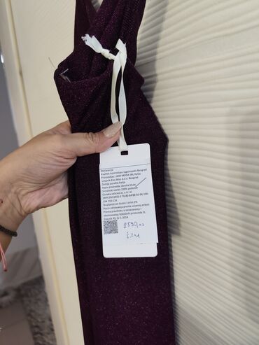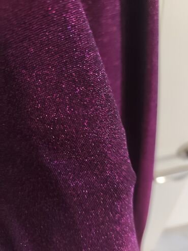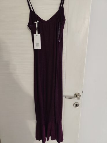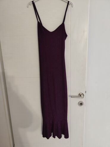 Duga haljina na bretele, bordo-ljubičasta sa metalik sjajem.