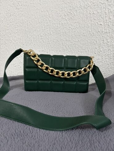 Zelena ženska torba preko ramena sa dekorativnim zlatnim lancem.