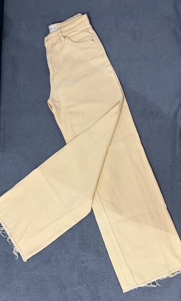 Visok strukŽenske pantalone od denima, širokog kroja (wide leg) u svetlo narandzastoj boji. Visok struk sa pet džepova i petljama za kaiš. Klasican džins kroj sa rajsferšlusom i metalnim dugmetom. Ravne, široke nogavice sa neravnim, resastim završecima za casual izgled. Lagani, blago elastični pamuk/denim materijal prijatan za svakodnevno nošenje. Diskretan label “DENIM” na unutrašnjem pojasu. Idealne za kombinovanje uz patike ili sandale.