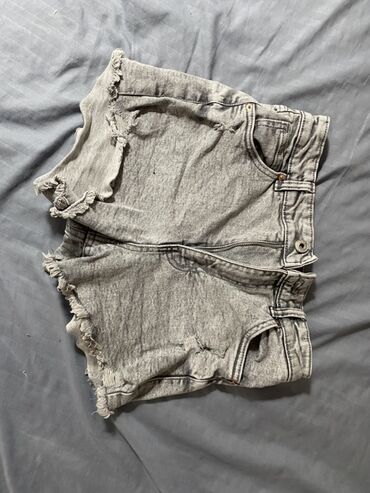 Sivi teksas šorts FB Sister – veličina S - Model: high-waist, klasičan petodžepni kroj (2 prednja + džepić za novčiće, 2 zadnja džepa) - Materijal: denim bez elastičnog dodatka (čvrst pamučni teks...