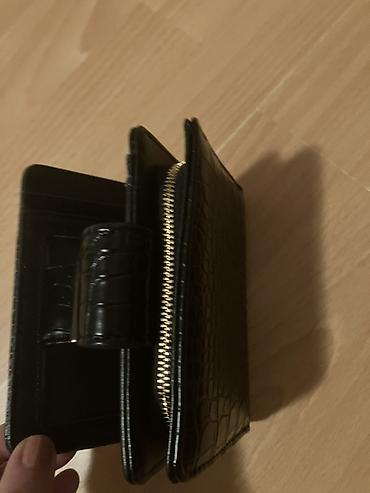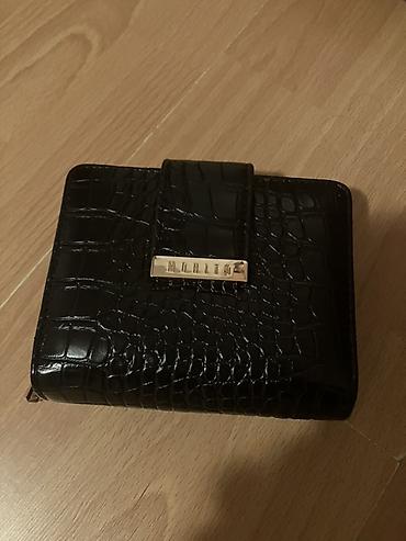 Crni ženski novčanik sa krokodil teksturom i metalnim detaljem na preklopu.