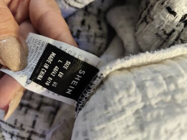- Materijal: tvid sa teksturom, bela osnova sa crnim kariranim/štraftastim uzorkom, diskretan sjaj u niti
