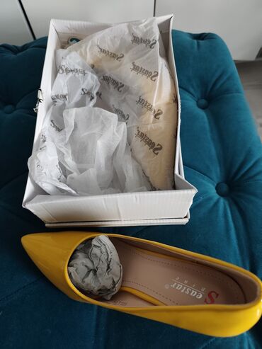 Elegantne salonke u zlatnoj boji - Model: klasične špic salonke - Veličina: 40 (označeno na đonu) - Boja/finish: metalik zlatna, blagi saten/shine efekat - Potpetica: tanka, približno 7–8 cm (proce...2 000 RSD