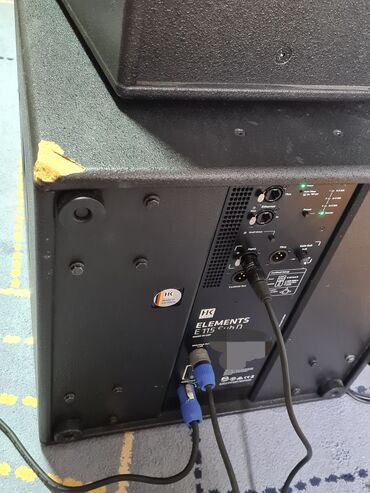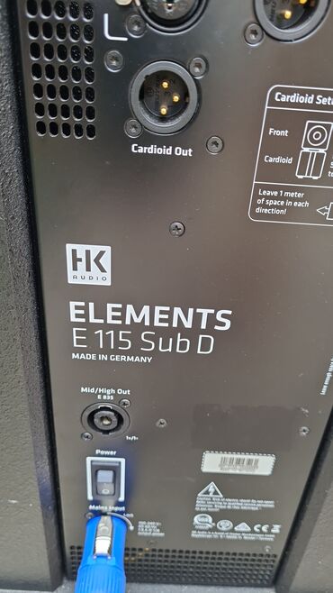 - Aktivni subwoofer HK Audio Elements E115 Sub D: integrisano pojačalo, panel sa ulazima/izlazima (XLR, speakON), kontrole nivoa i filtre, mrežni priključak i preklopnici. Dizajniran za pokretanje gornjih satelita kroz speakON konekcije.