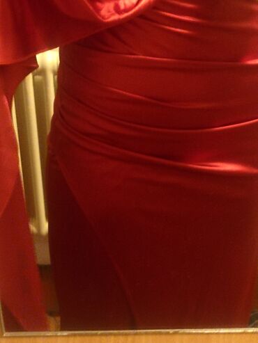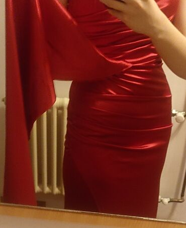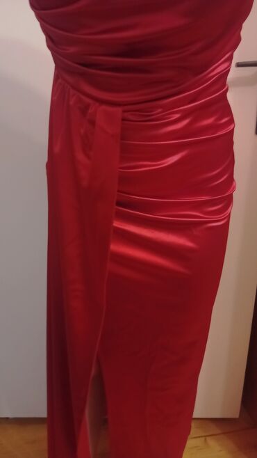 Elegantna večernja haljina u intenzivno crvenoj boji. Model je dugačak, sa visokim šlicem sa jedne strane u vel S/M jednom obucena za ozbinjo zaintetesovane saljem snimak800 RSD