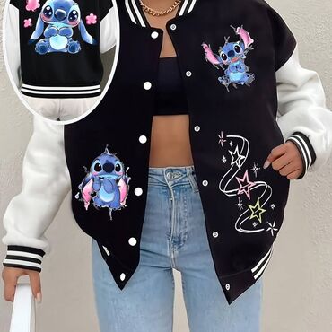 Dodaj zabavan i moderan detalj svom stilu! Ova crno-bela bejzbol jakna sa plavo-roze printom Sticha kombinuje klasične boje sa veselim crtanim motivom. Oli izrezi na dugmadima i kontrastni obrub čine je savršenom za svakodnevnu jesen/zimu, casual izlazak ili party. Izdržljiva tkanina garantuje dugotrajnost, a veseli print donosi osmeh gde god da ideš.