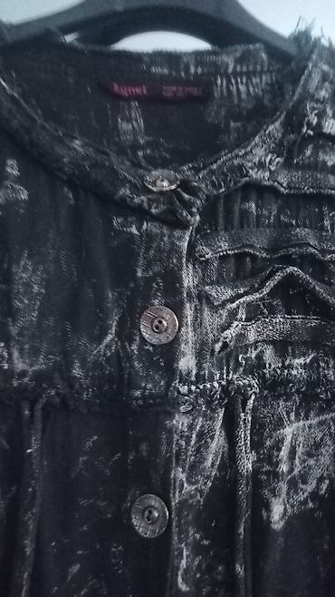 Crna tunika/košulja-haljina sa kragnom i poludugim rukavima. - Materijal: lagana tkanina prijatna za nošenje. - Kopčanje sprijeda sa 4 dugmeta.. - Raglan/epolete detalji na ramenima. - Dekorativni...