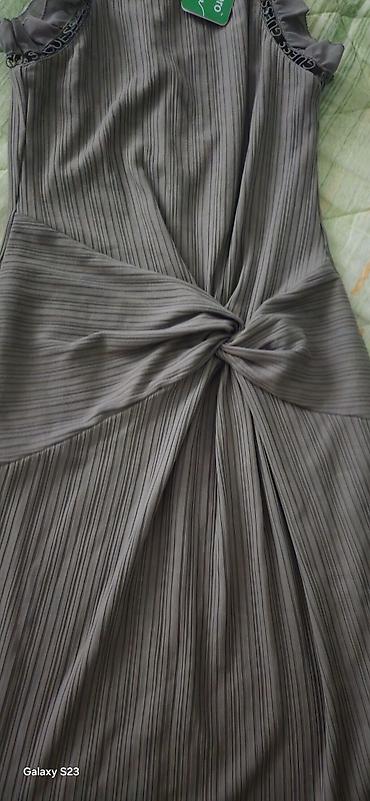 - Dizajn: fino plisirana tkanina sa suptilnim vertikalnim prugama; dekorativno čvor-nabrano preklapanje u predelu struka koje vizuelno sužava figuru