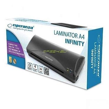 Laminator Esperanza EFL001 NOVO. Opis proizvoda: Esperanza EFL001 - Laminator A4 INFINITY Laminator će se pokazati korisnim za kućne i male uredske aplikacije. ✨ Jedinica je sigurna i laka za upotrebu. Odmah ćete laminisati dokumente do A4 formata, tople ili hladne. Pomoću Laminatora možete brzo i povoljno zaštititi relevantne dokumente, fotografije, skice i crteže duži vremenski period. Njegova kompaktna veličina i moderni dizajn uklopit će se u bilo koji enterijer kod kuće ili u uredu. SPECIFIKACIJE: Potrošnja energije: 265V. Napon: 220 - 240V. Frekvencija: 50Hz. Struja: 1.15A Debljina filma za vruće laminiranje: mikrona. Maksimalne dimenzije dokumenta: 210 x 297mm (format A4). Maksimalno vreme zagrevanja: oko 5min. Brzina laminacije: 250mm u minuti. Maksimalna širina lima: 240mm. Toplo i hladno laminiranje. Maksimalna debljina laminiranog lima: 0,6mm. LED: Snaga / Spremno. Karakteristike: COLD / OFF / HOT. Broj rolni: 2. Laminiranje fotografija. Materijal: visokokvalitetna plastika (ABS). Dužina kabla: oko 154cm. Zaštita od pregrevanja. Dimenzije jedinice: 345 x 140 x 65mm. Uključeno: 5 x A4 folije.