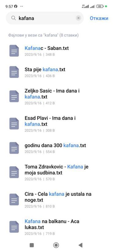- Datoteke u .txt formatu, pregledne i lake za pretragu po nazivu izvođača ili ključnoj reči (primer: „kafana“).
