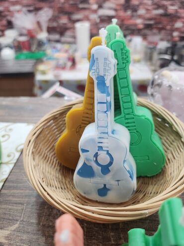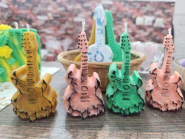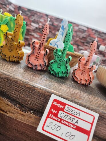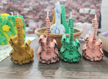 - Dekorativne ručno rađene sveće oblikovane kao električna/akustična gitara, sa istaknutim detaljima vrata, žica i tela instrumenta