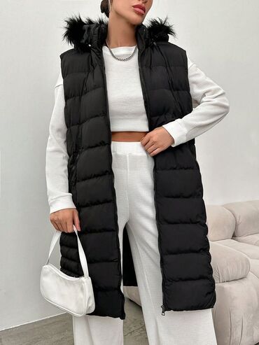Ženska duga zimska prsluk-jakna sa kapuljačom. Velivine S M L XL - Model: punjeni, prošiveni prsluk bez rukava - Dužina: do ispod kolena, sa bočnim rasporima pri dnu radi lakšeg kretanja - Zatvaran...