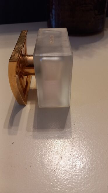 - Bočica: matirano staklo pravougaone forme sa zlatnim poklopcem u obliku slova “E” i diskretnim Escada logotipom