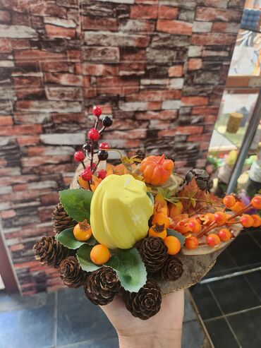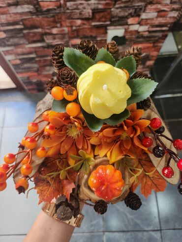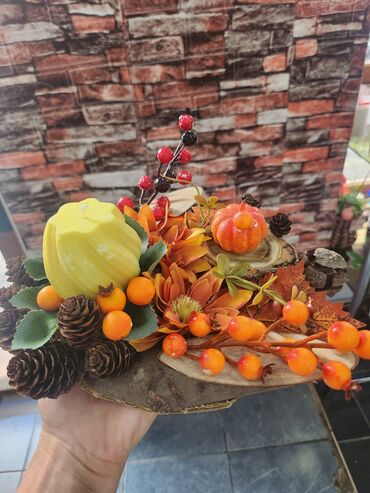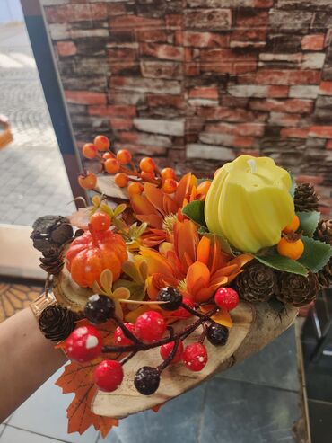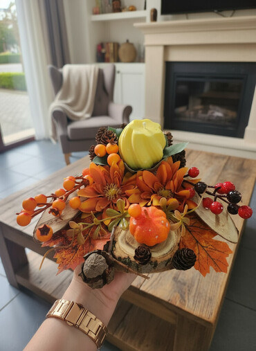 Jesenji dekorativni aranžman na drvenoj podlozi
