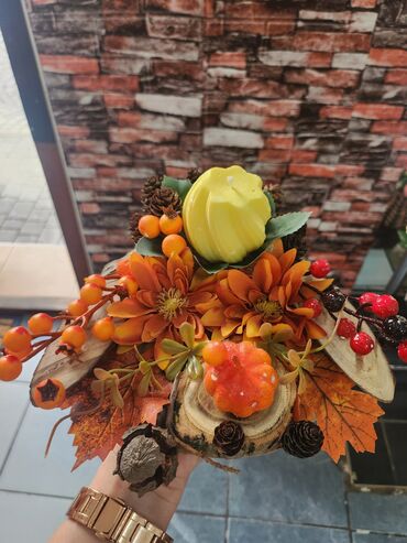 - Baza od prirodnog drveta, ukrašena šišarkama, veštačkim zelenilom i jesenjim lišćem